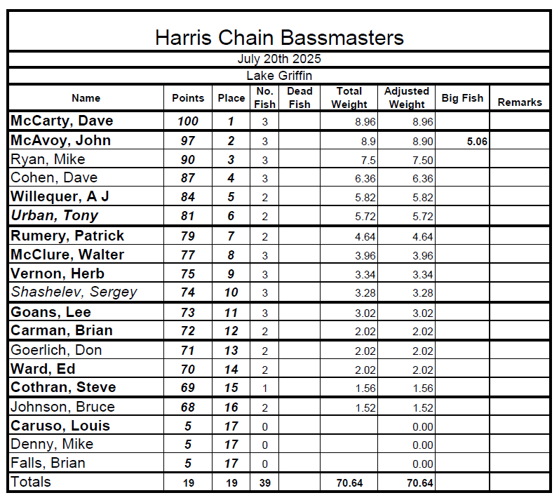| June-Home Results | 21st (Sat) | Lake Apopka McDonald Canal Boat Ramp |