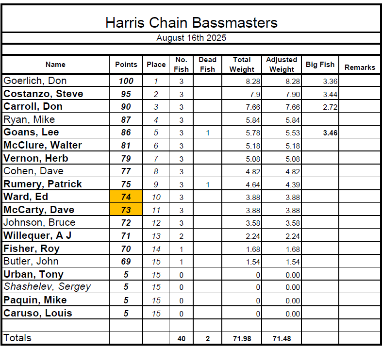 | Co-Angler 1st: | Brian Falls | 4 | 7.78 |