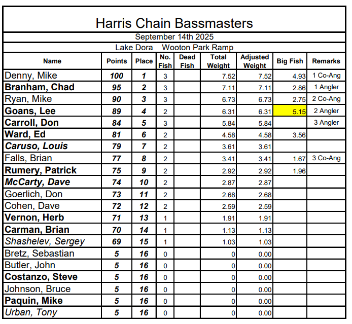 | October-Home Results | 18th (Sat) | Lake Eustis Eustis Ramp (aka Buzzard Beach ramp) |